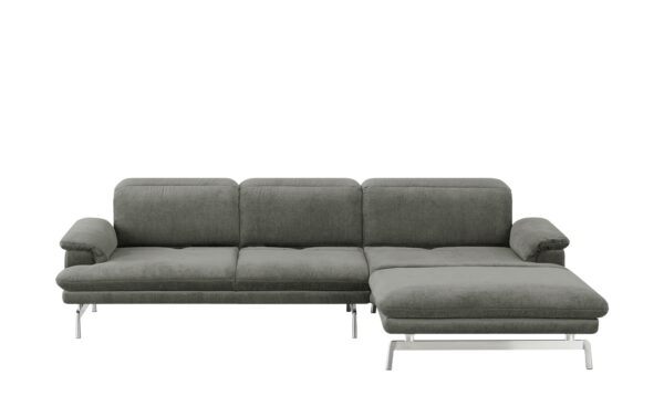 Der graue Bezug aus feinstem Stoff fühlt sich angenehm auf der Haut an und lädt zum Entspannen ein. Die weiche Polsterung sorgt für optimalen Sitzkomfort, sodass Sie sich nach einem langen Tag einfach zurücklehnen und die Seele baumeln lassen können. Die großzügige Eckform bietet ausreichend Platz für die ganze Familie oder Freunde.